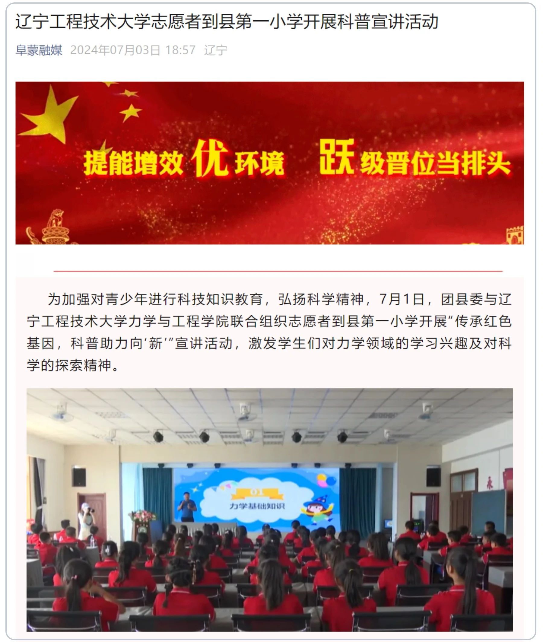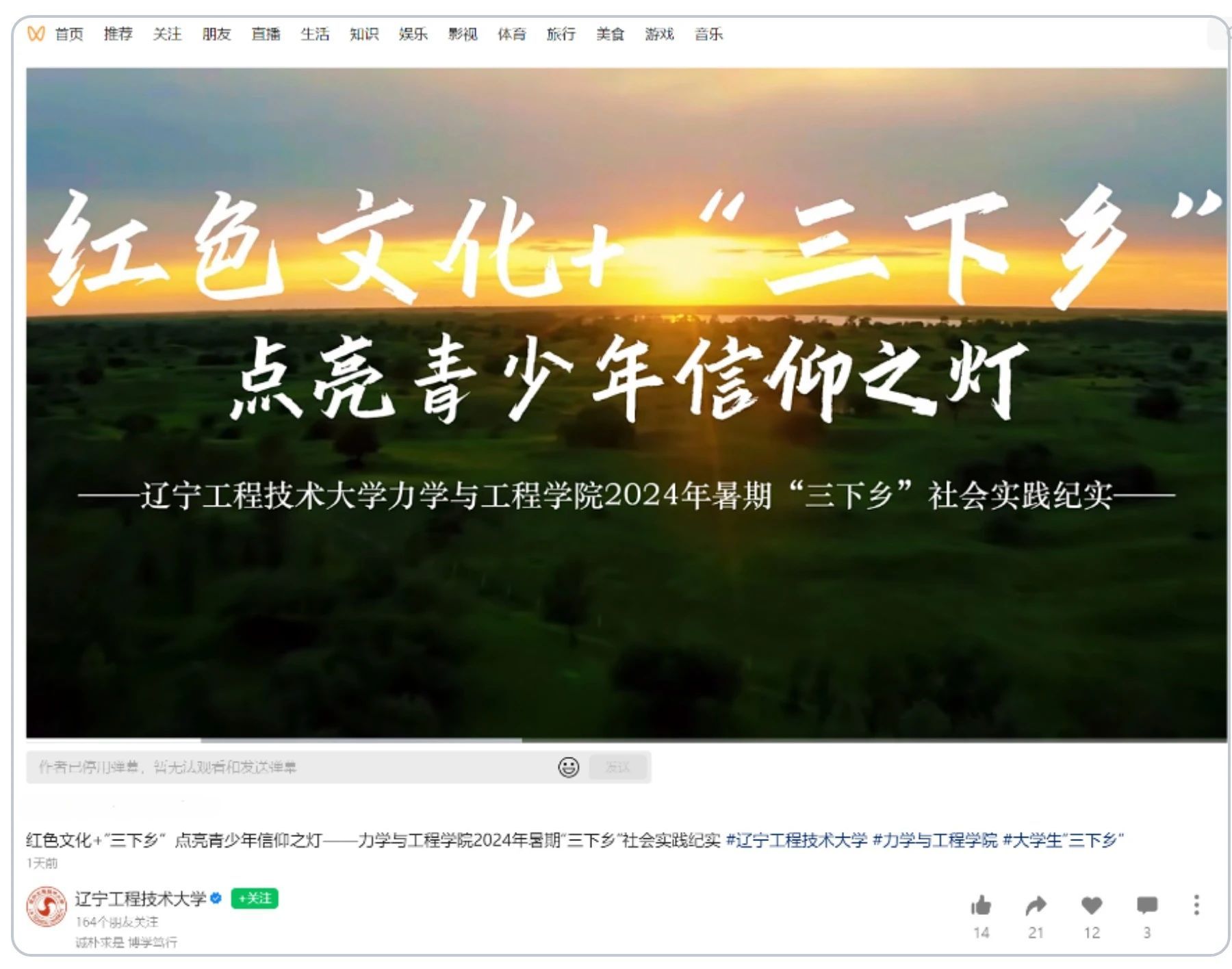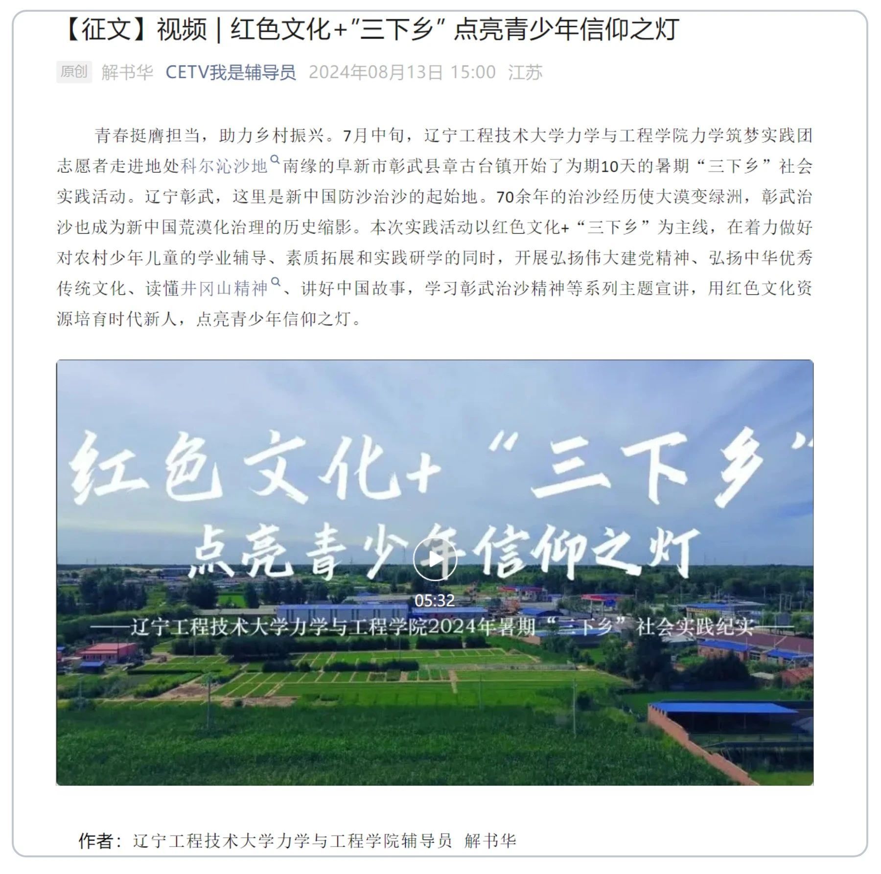 2024年暑期,公司2022级、2023级同学全员参与社会实践,2021级同学全员参与专业实践,总计成立21个团队,开展了形式多样的社会实践活动,各团队注重提升社会实践活动的质量内涵和社会影响力,加强对实践过程、活动效果的宣传报道。实践活动被中国教育电视台、学习强国平台、辽宁日报、公司官方微信公众号、公司“太阳石之光”官方微信公众号、高校辅导员工作室、彰武县共青团、阜蒙融媒等多方媒体报道,另有学院官方微信公众号发布新闻20余篇,这些报道生动地展现了公司学子在暑期社会实践中的风采和成果。其中,力学筑梦实践团入选2024年团中央青年志愿者行动指导中心“七彩假期”志愿服务团,实践团走进地处科尔沁沙地南缘的阜新市彰武县章古台镇开展了为期10天的暑期“三下乡”社会实践活动。本次活动中,力学筑梦实践团李佳音同学作为代表分享了他们的实践经验与实践故事,详述了暑期社会实践自筹备至实施的全过程,畅谈活动中的经验举措与心得体会,让同学们在实践队员的切身经历中感受实践的魅力。