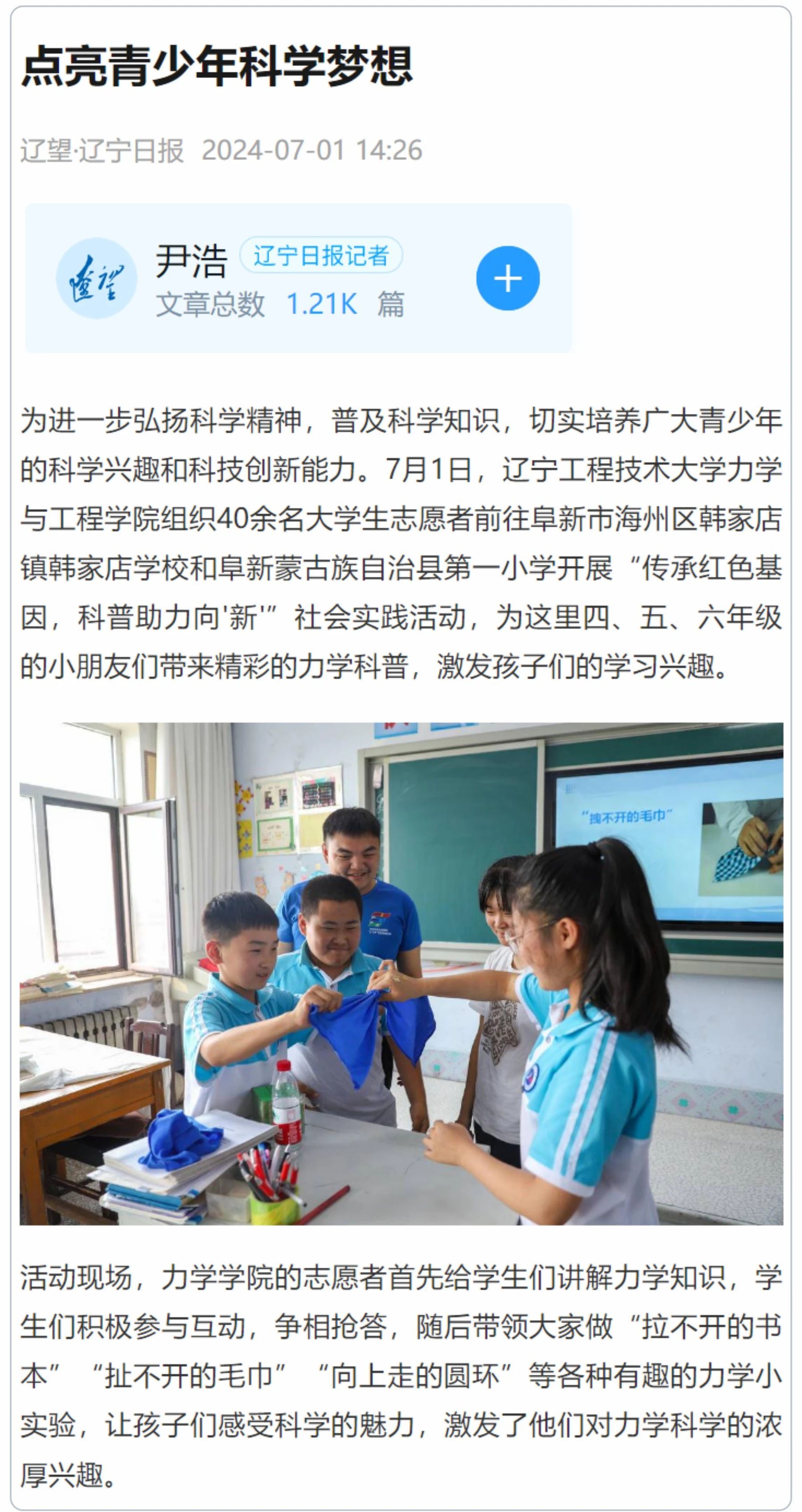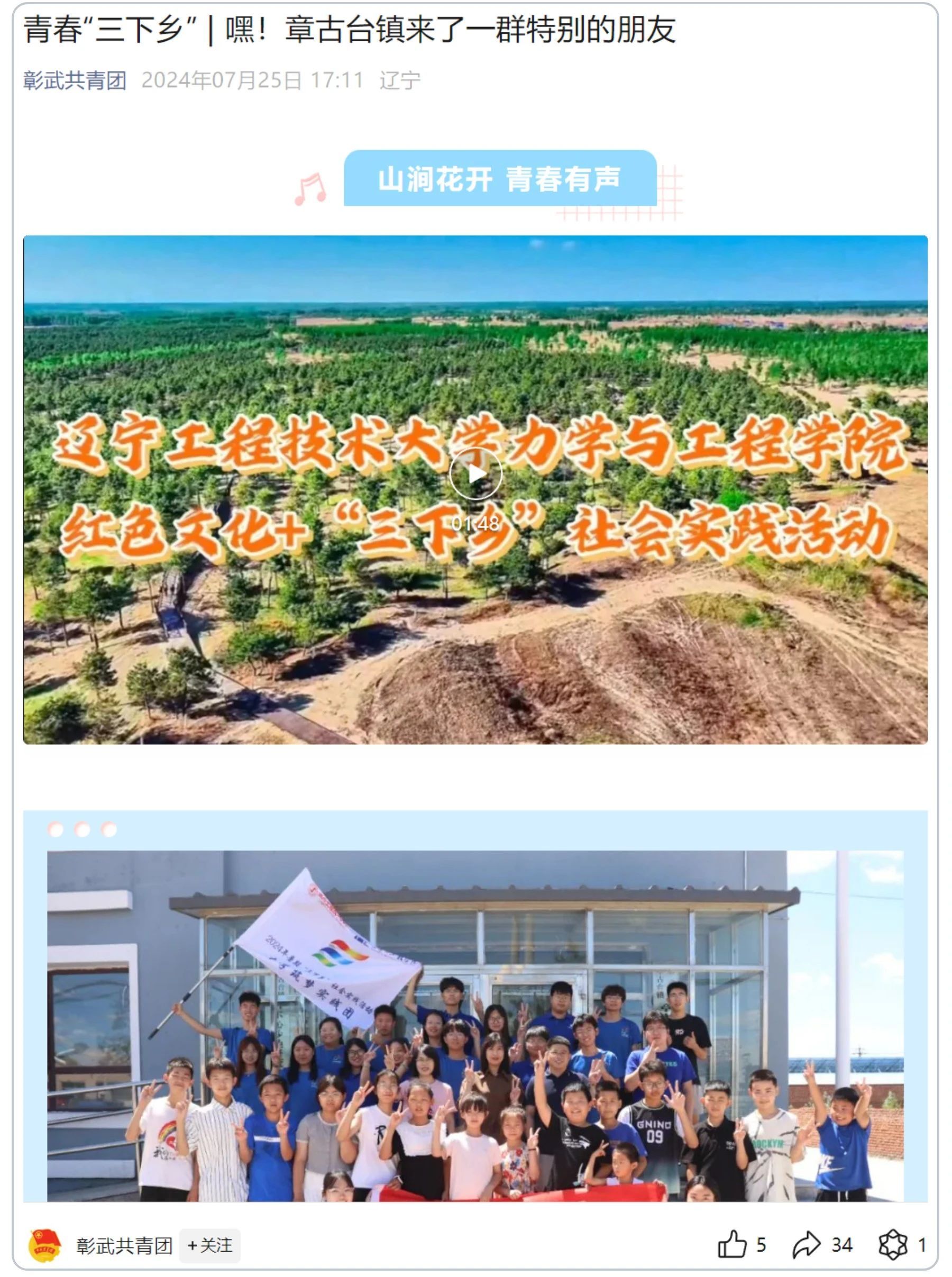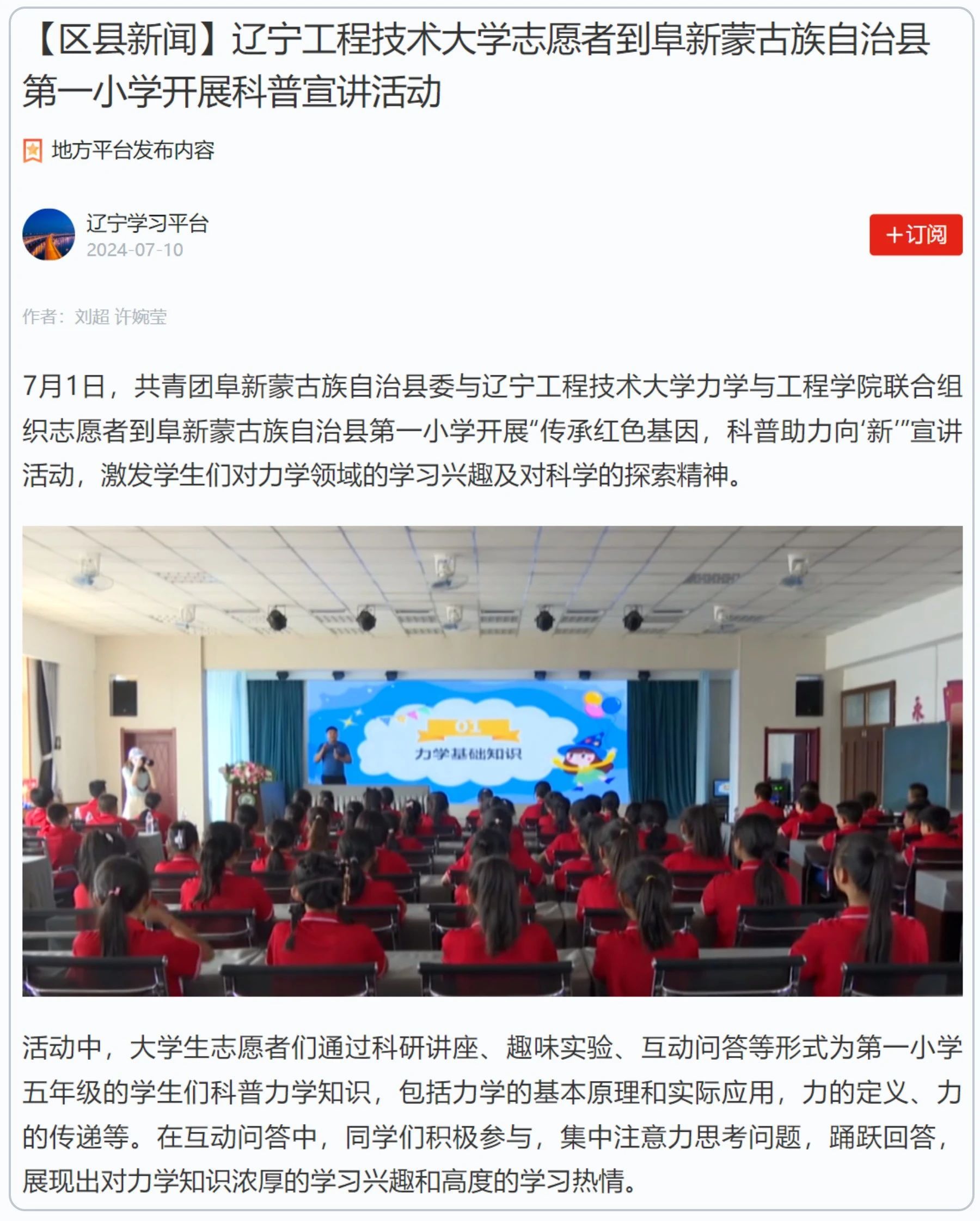 2024年暑期,公司2022级、2023级同学全员参与社会实践,2021级同学全员参与专业实践,总计成立21个团队,开展了形式多样的社会实践活动,各团队注重提升社会实践活动的质量内涵和社会影响力,加强对实践过程、活动效果的宣传报道。实践活动被中国教育电视台、学习强国平台、辽宁日报、公司官方微信公众号、公司“太阳石之光”官方微信公众号、高校辅导员工作室、彰武县共青团、阜蒙融媒等多方媒体报道,另有学院官方微信公众号发布新闻20余篇,这些报道生动地展现了公司学子在暑期社会实践中的风采和成果。其中,力学筑梦实践团入选2024年团中央青年志愿者行动指导中心“七彩假期”志愿服务团,实践团走进地处科尔沁沙地南缘的阜新市彰武县章古台镇开展了为期10天的暑期“三下乡”社会实践活动。本次活动中,力学筑梦实践团李佳音同学作为代表分享了他们的实践经验与实践故事,详述了暑期社会实践自筹备至实施的全过程,畅谈活动中的经验举措与心得体会,让同学们在实践队员的切身经历中感受实践的魅力。